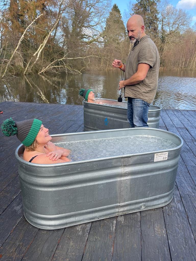 In fact ice is a bit of a theme for this week as – and yes I know this sounds mad – I went on a Wim Hof ice day (that’s me sitting in an ice bath in the green hat, with my husband in the other one. My brother said we looked like cans of sardines).